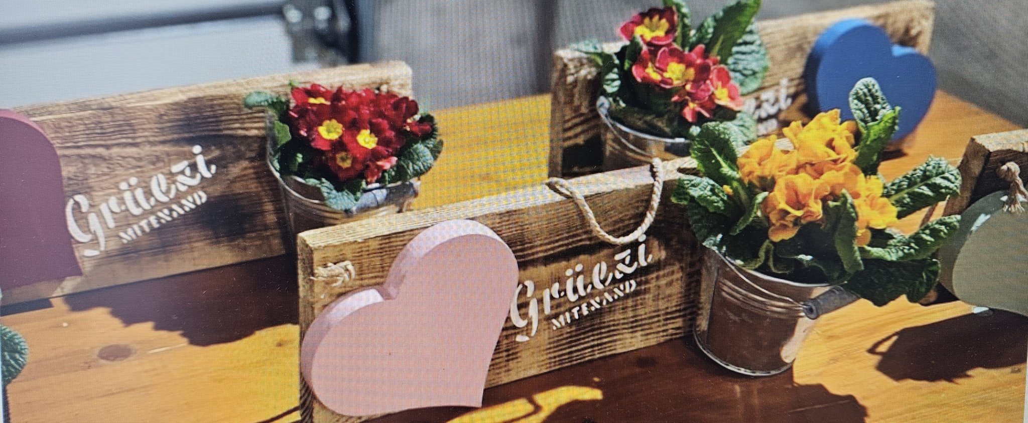 Wir gestalten aus einem Palettenbrett mit dem Bunsenbrenner, Farbe und Pasten einen wunderschönen Frühlingsgruss für den Eingang